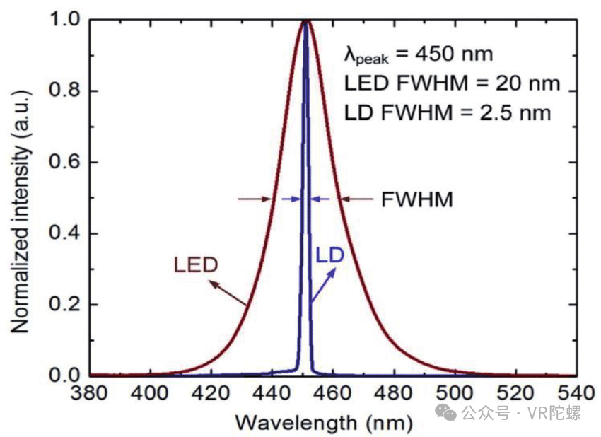 我们先从光源侧展开,再从图像调制侧展开。激光,相对于普通的光,比如LED,物理本质的差异主要有光谱带宽、偏振、相干性。而围绕这三个特性,在光学显示性能方面,直接与亮度、色域、功耗和体积等显性指标密切相关。