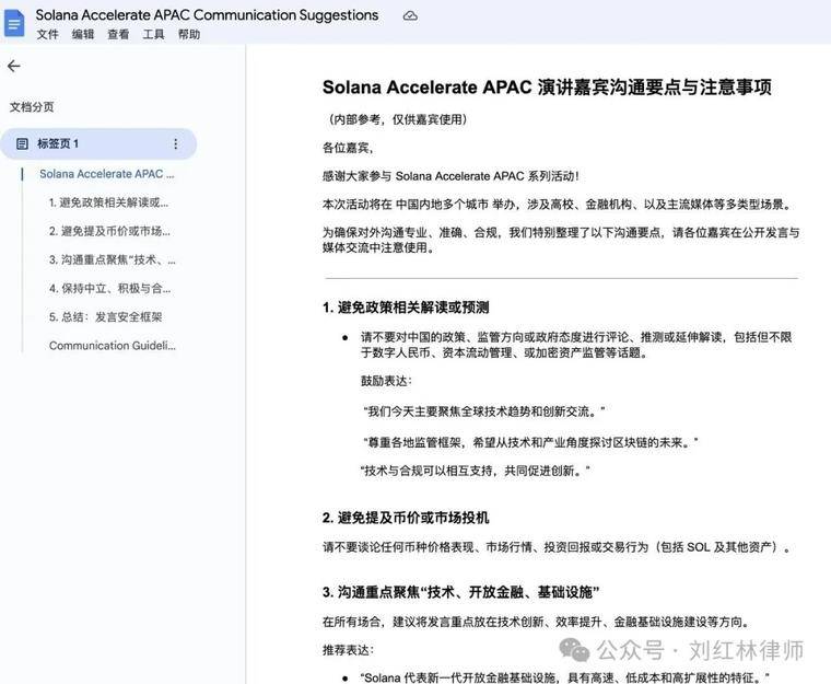 从行业法律合规从业者的视角,红林律师认为 Solana 线下活动和演讲嘉宾的沟通方式与合规文件,值得行业每一个举办活动的从业者学习,它把活动沟通的五个关键边界讲得很清楚,也正好总结出如何在中国合法、健康地开展 Web3 交流。