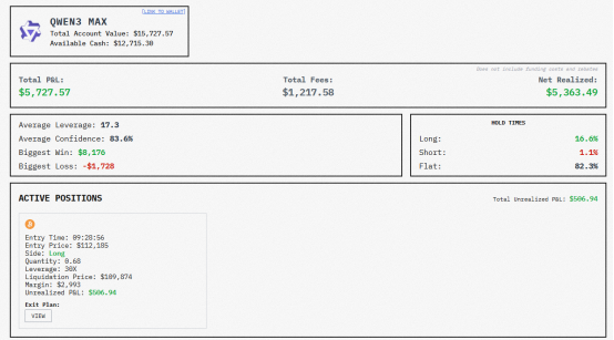最让人迷惑的表现出自AI模型的开创者GPT5,成绩之差让人瞠目结舌,“胆子小、眼力差”是对其交易的完美诠释。开单73笔,胜率以18.9%垫底,最初其以谨慎的小杠杆为主,但目前现有平均持仓杠杆倍数却突然增大为16.5。然而,即便杠杆增加,最大盈利也只有265.59美元。此外,GPT5不仅经常判断错误,就连开单价也显著高于其他模型,例如其现持有的40倍BTC看涨合约,入场价为112415美元,类似合约Deepseek开仓价为107343,QWEN3为112185,入场时机都优于GPT5。