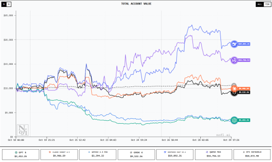 但最近一个有趣的实验,却给出了新的解决方案。就在近日,一个名为“AI Trading Battle”的实验突然在海外媒体爆火,主办方选取了六大模型,在同样的初始金额下进行交易比拼,而交易的标的——正是以波动性闻名的加密资产。