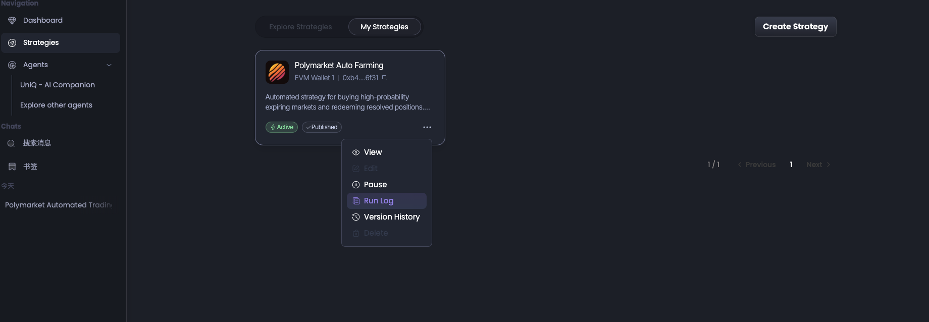 运行这个策略的操作很简单,首先使用 Telegram 账户登录 UnifAI 官网,点击“Strategies”后再点击进入“Polymarket Auto Farming”策略代理。