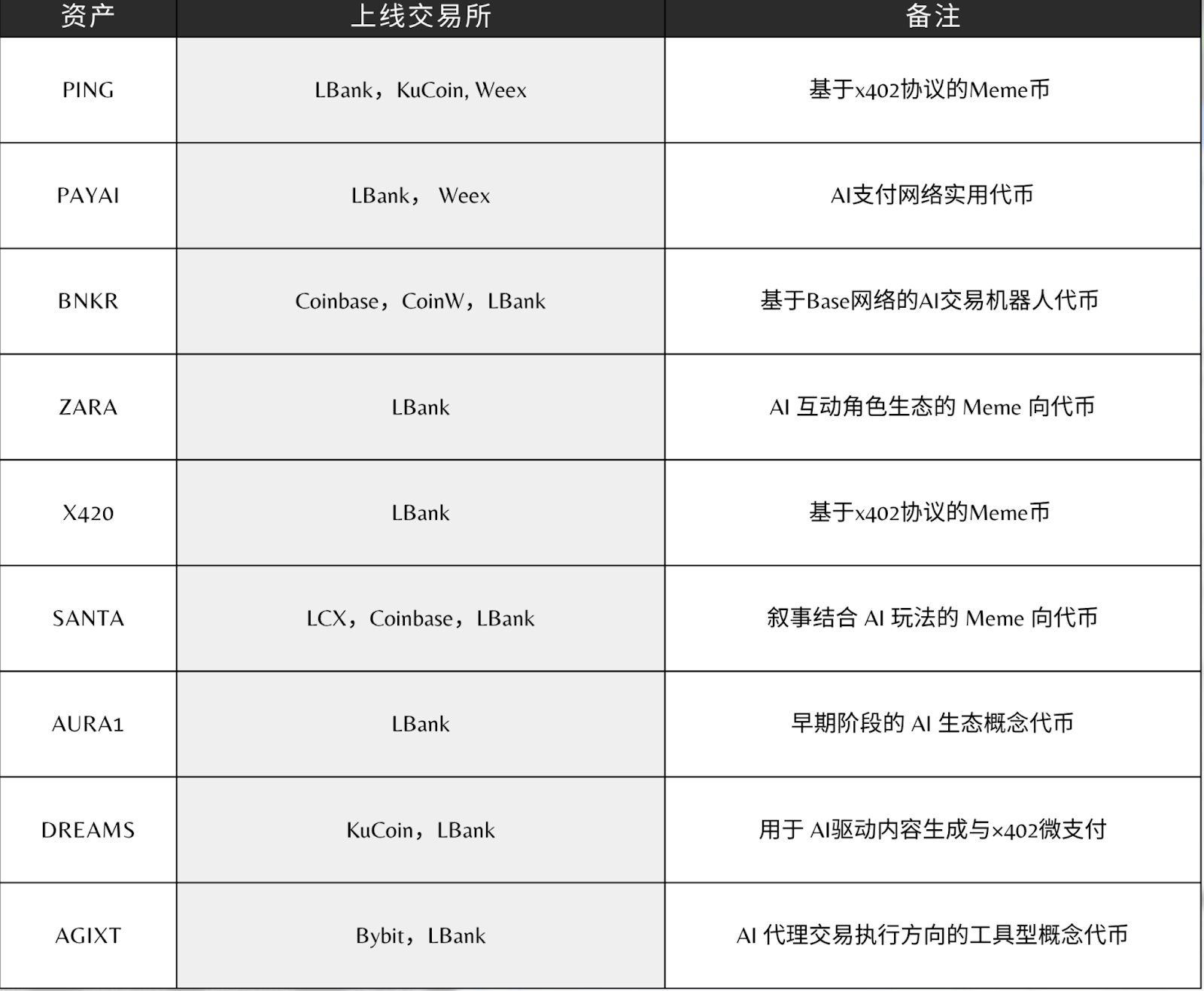 数据显示,在 X402 板块情绪最鼎盛的 10 月中旬,LBank 承接的X402生态日均交易额占比超过 27%,成为这一叙事中资金流量最集中的入口之一。平台上线的相关资产整体表现亮眼,其中包括 PING(最高涨幅 989%)、PAYAI(875%)、BNKR(654%)、ZARA(347%)、X420(291%)、SANTA(250%)、AURA1(240%)、AGIXT(213%)、DREAMS(198%)以及 DIRA(155%)。十个核心项目平均最高涨幅约为 421%,明显领先市场整体表现,使 LBank 成为投资者在早期叙事布局中的优选渠道。