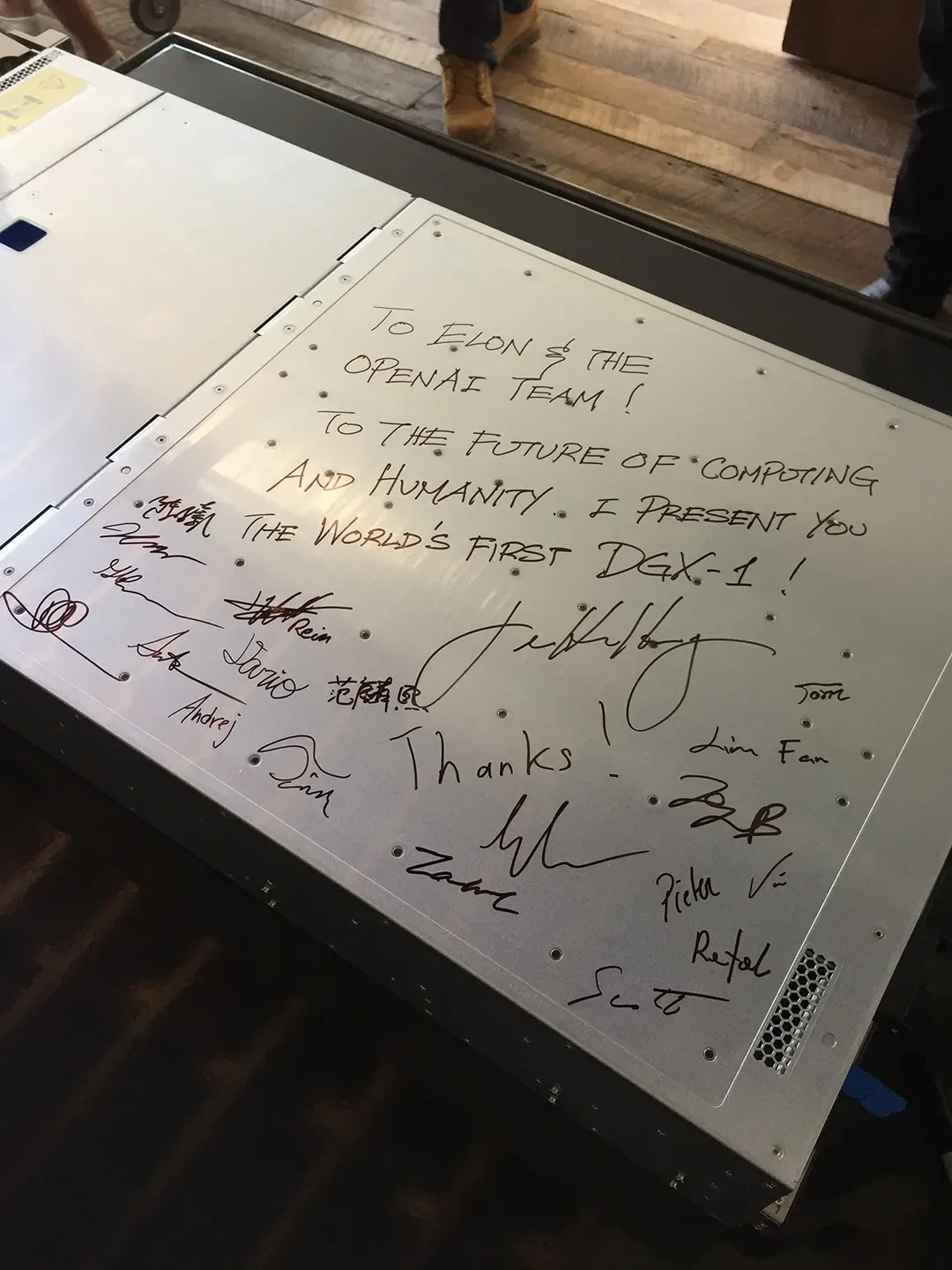 2016 年 8 月,一个历史性时刻诞生, 英伟达向刚成立的 OpenAI 捐赠了英伟达的第一台 AI 超级计算机 DGX-1,黄仁勋本人亲自将这台计算机送到了 OpenAI 的办公室 ,当时的董事长埃隆·马斯克用开箱刀打开了包裹。