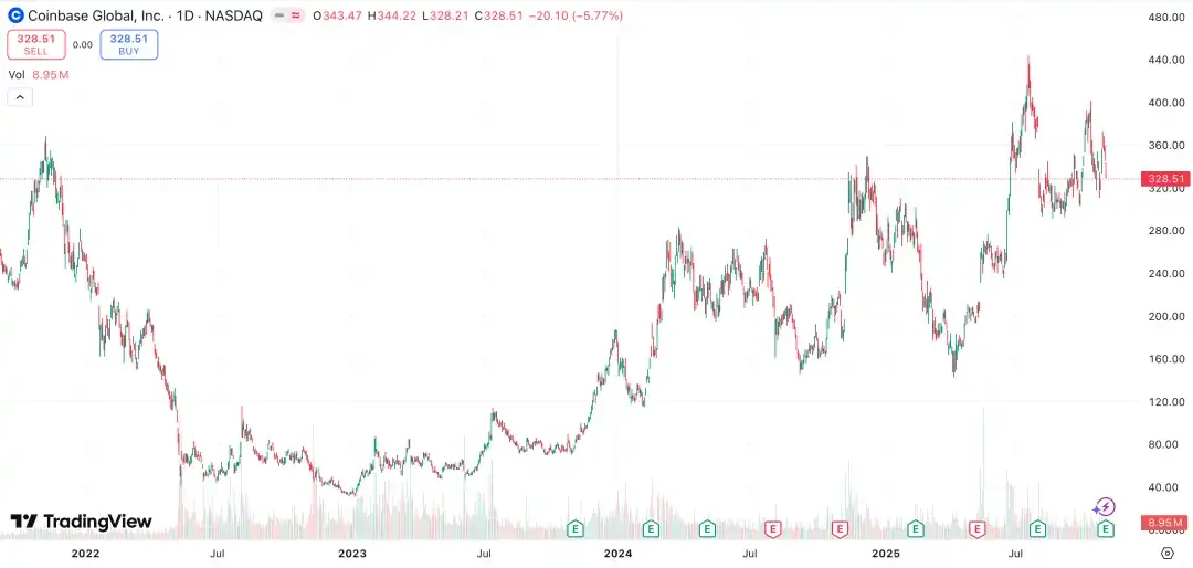回想 2023 年至今,加密第一股 Coinbase 的股价像过山车,从低谷的 30 美元爬到如今的 300 美元上方,靠的不是运气,而是两条腿走路:Base 和 USDC。