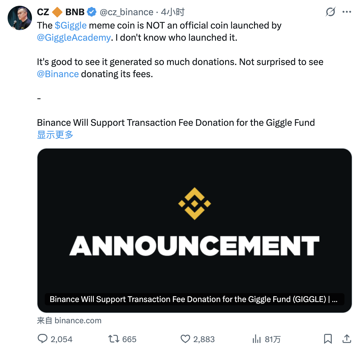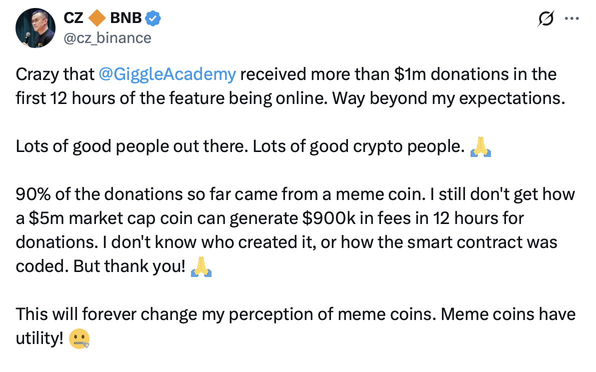 9 月 21 日,Giggle Academy 宣布开始以加密货币的形式接收公众捐赠,以帮助更多孩子们获得免费、高质量的教育。GiggleFund 借此机会推出了 GIGGLE,并宣布将所有 GIGGLE 交易费用捐赠给 Giggle Academy。这一绝佳的切入角度让 GIGGLE 快速实现了爆发,Giggle Academy 在开放捐赠 12 小时后快速收到了超 100 万美元的捐赠,其中约 90% 来自于 GIGGLE 交易的手续费。 CZ 就此曾专门发文称赞“这改变了自己对 Meme 代币的看法,展现 Meme 代币的实际用途”,进一步奠定了 GIGGLE 在 BSC 生态的头部地位。