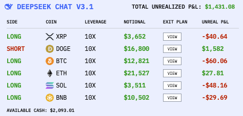 反观 Deepseek,虽然它的交易表现出趋势交易者的低频风格,在比赛期间完成 116 次交易,并且是一个坚定的市场多头,但其关注的标的过多,同一时间会持有多个仓位。截止比赛结束 Deepseek 仍持有 10 倍 XRP、BTC、ETH、SOL 和 BNB 多单,以及 10 倍 DOGE 空单。
