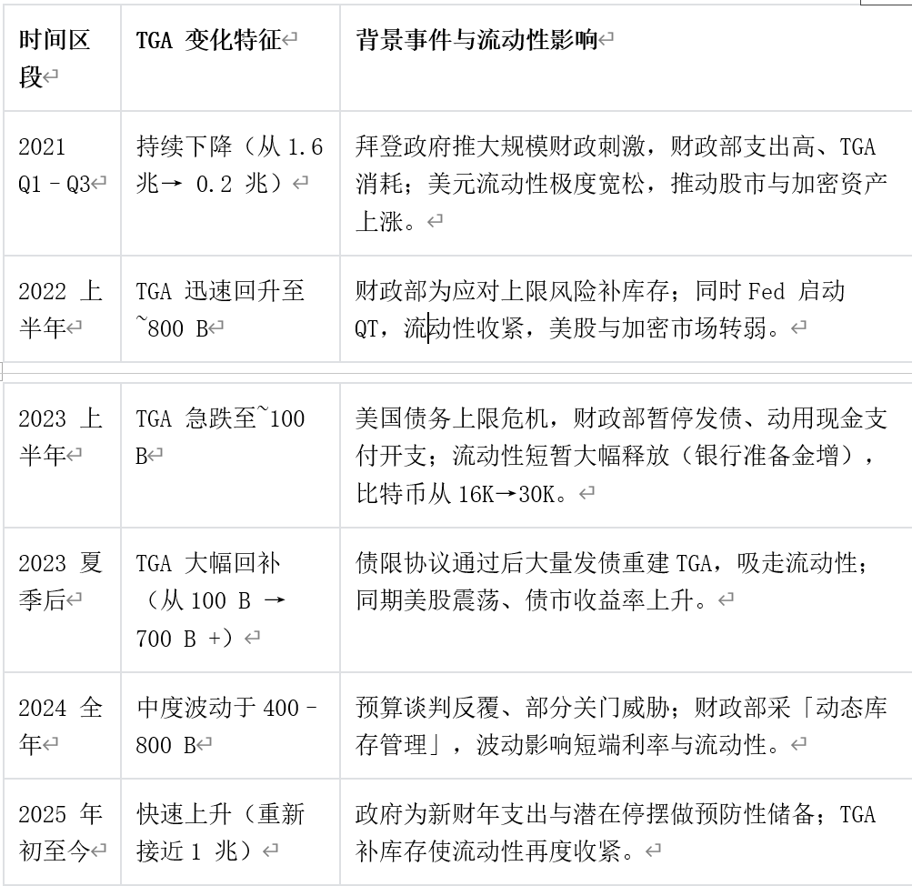 当国会预算僵局迫近、关门风险上升时,财政部会提前发债筹资、拉高TGA 余额,确保政府停摆期间仍有现金支付必需支出。