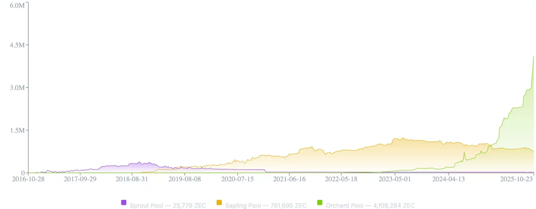 目前,Orchard 屏蔽池内拥有超过 400 万 ZEC(约占流通供应量的 25%),在总计约 490 万被屏蔽的 ZEC 中占绝大多数。