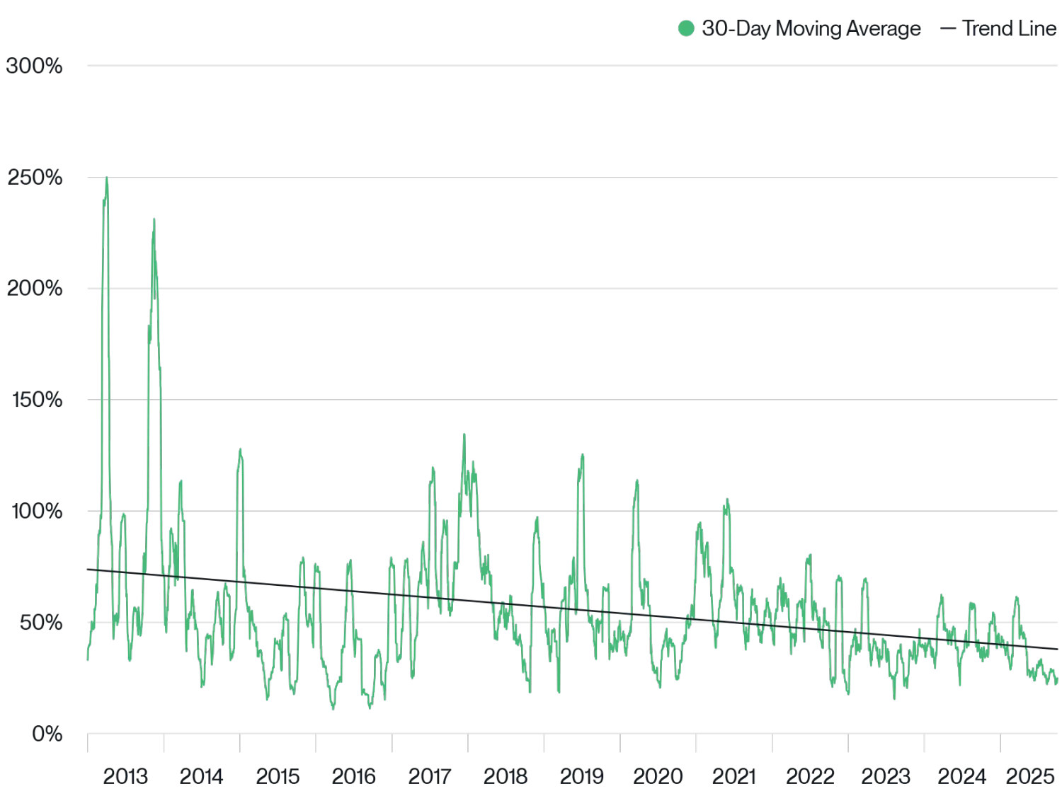 比特币当前的情况亦是如此。随着比特币的持有者从「早期爱好者」转向「机构投资者」,加之其技术不断成熟,如今的比特币已不再面临十年前那种「关乎生存的风险」,它已成为一种成熟的资产类别。这一点从比特币的波动率中可清晰看出 —— 自 2024 年 1 月比特币 ETF 开始交易以来,其波动率已大幅下降。