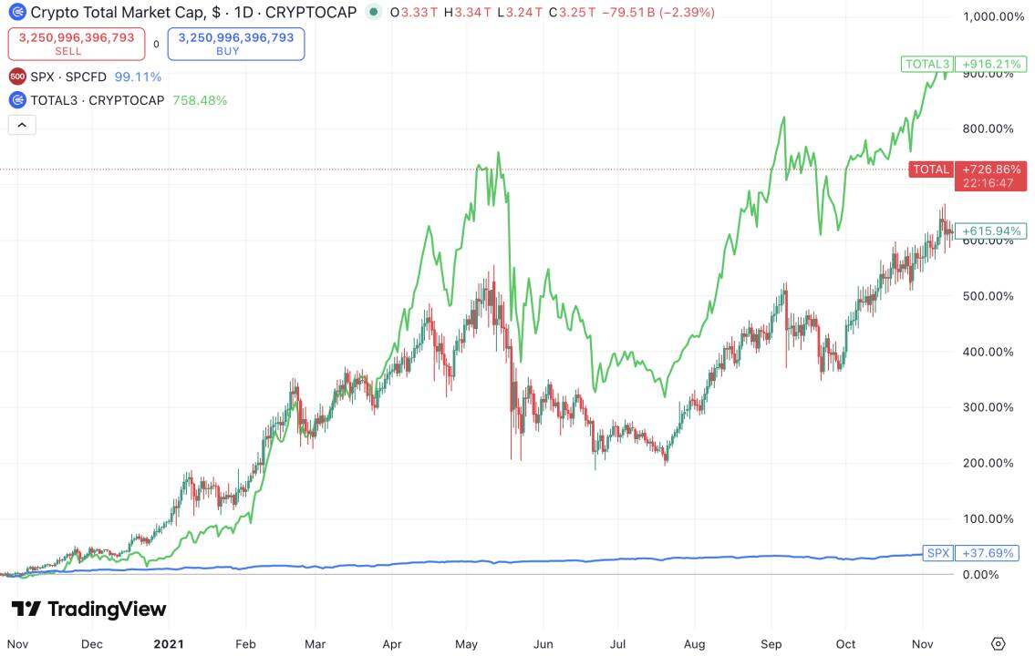 绿线:除了BTC和ETH以外的山寨币总市值;