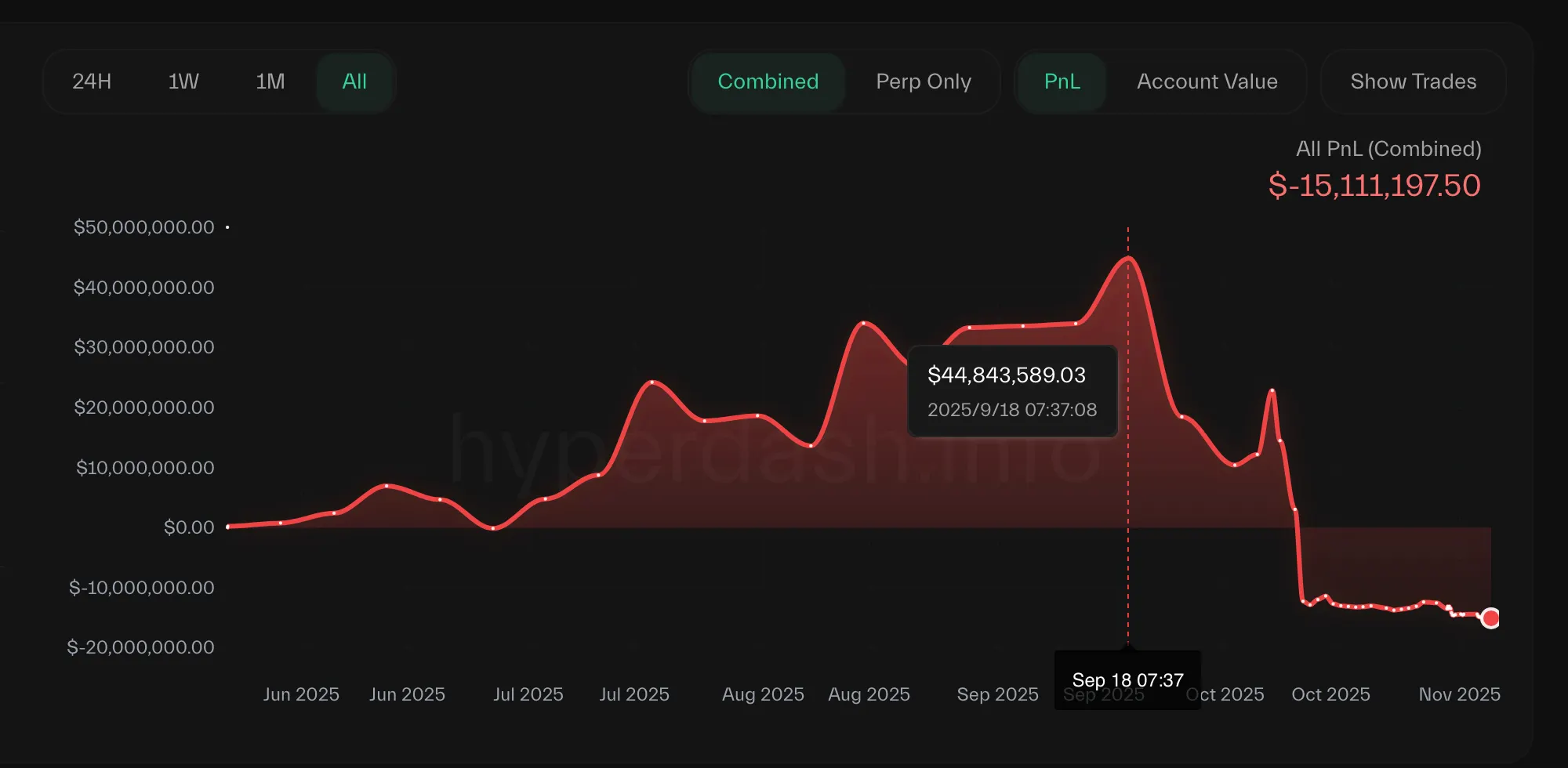 10 月,是彻底坍塌的开始。巅峰时的近 4500 万美元浮盈 ,在 20 天内几乎消失殆尽。到 10 月 9 日 ,账户盈利仅剩约 100 万美元 。次日,他被迫平掉 XPL 等仓位, 单日亏损 2153 万美元 ,从此账户正式由盈转亏。