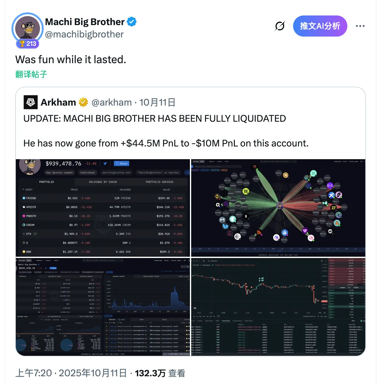 这场循环在十月重复了不下十次。 像一个输红眼的赌徒 ,不断“补仓”,但每一次补仓都被更猛烈的下跌无情吞噬。10 月 11 日、10 月 14 日、10 月 23 日、10 月 30 日……他的仓位被一次又一次地清算。尽管期间市场偶有反弹,让他小额仓位出现近百万美元浮盈,但相较于巨大的亏空,这只是杯水车薪。到 10 月 31 日,他的总亏损已达 1450 万美元 。