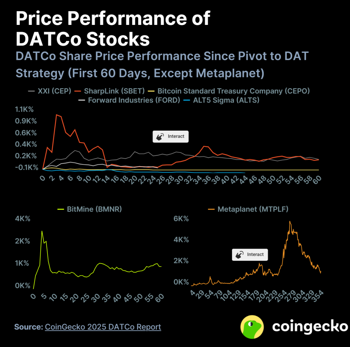- DATCo 股票在最初 10 天内暴涨(例如 BitMine 涨幅达 3,069%),随后普遍出现回调。