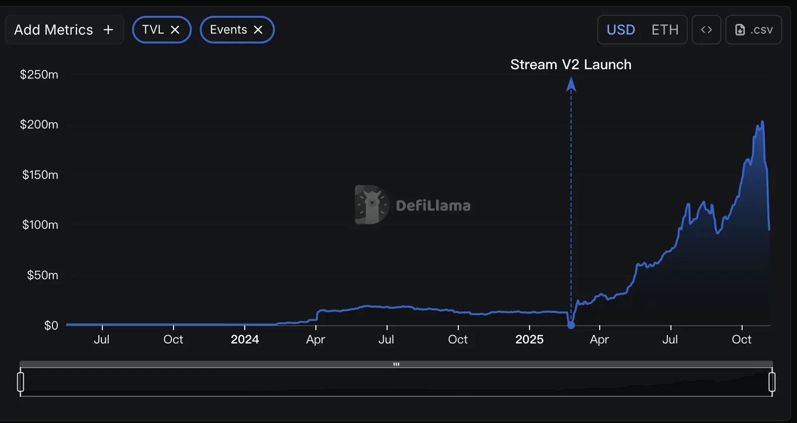 Stream Finance 正是这种不透明操作的典型。根据链上数据分析,Stream 声称拥有高达 5 亿美元的总锁仓价值(TVL),但根据 DeFillama 数据,Stream 的 TVL 在最高点仅有两亿,这意味着,超过五分之三的用户资金,都流向了不为人知的链下策略,由一些神秘的专有交易员进行操作,彻底脱离了 DeFi 应有的透明度。