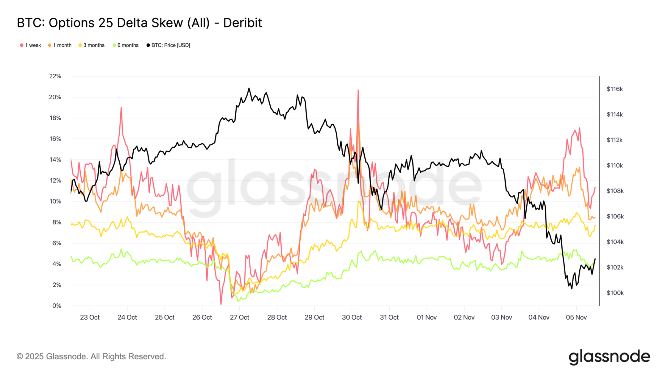 长期到期波动率同样走高:一个月期波动率较 11 万美元附近的调整前水平上升约 4 个波动率点,六个月期波动率上升约 1.5 个波动率点。这一模式凸显了经典的 「恐慌 - 波动率」 关系,快速价格下跌仍会驱动短期波动率飙升。