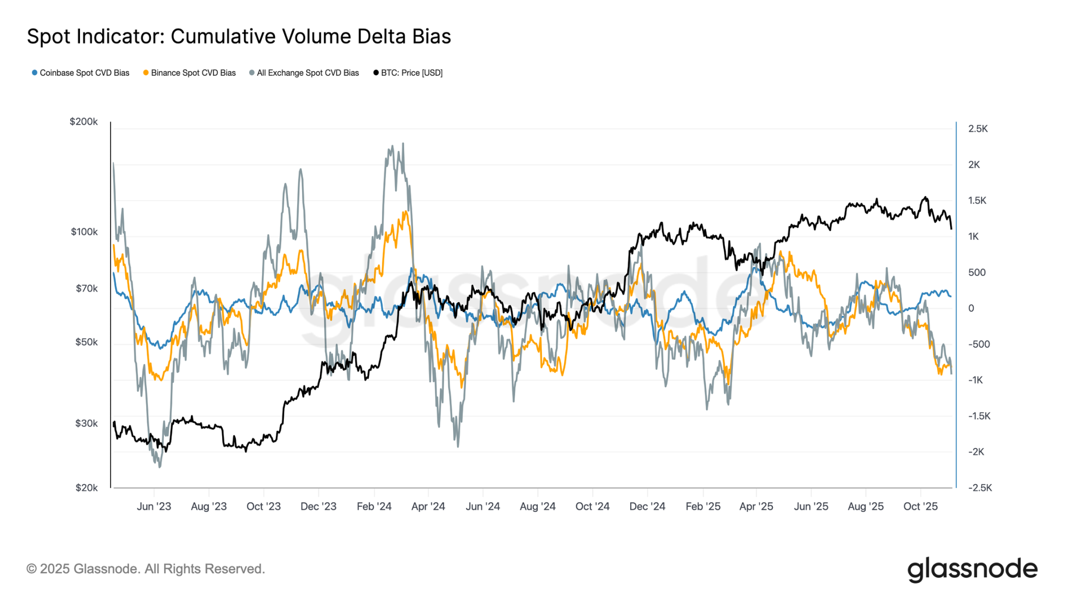 - 美国现货比特币 ETF 出现持续资金流出(每日流出 1.5 亿 - 7 亿美元),主要交易所的现货累计成交量差值(CVD)显示卖压持续,自主交易需求减弱。