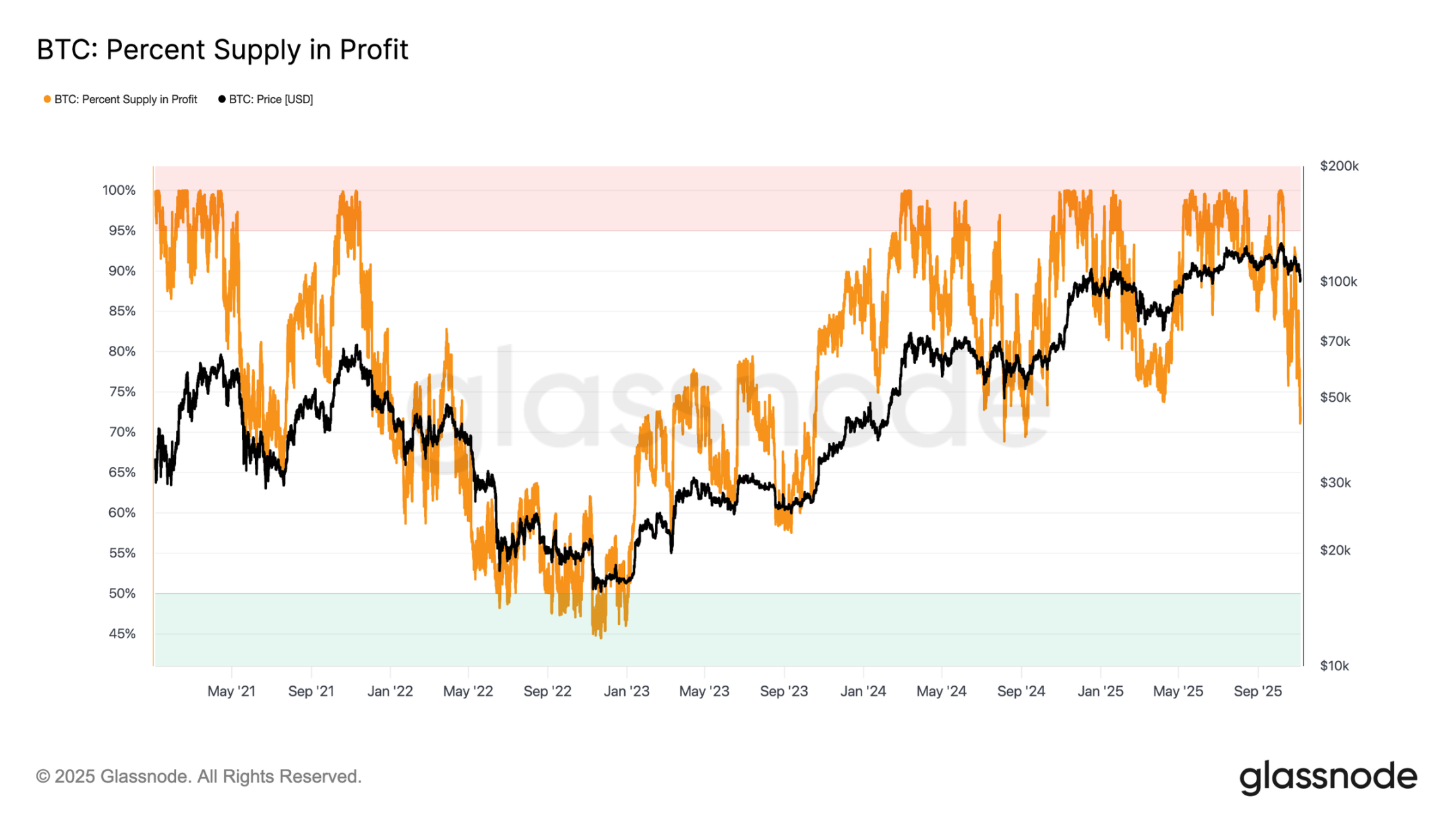 进一步分析可以发现,此次调整形成的结构与 2024 年 6 月及 2025 年 2 月相似 —— 这两个时期,比特币均处于 「反弹」 与 「深度收缩」 的关键十字路口。目前 10 万美元价位下,约 71% 的供应仍盈利,使市场处于中期放缓阶段典型的 70%-90% 盈利供应均衡区间下限。