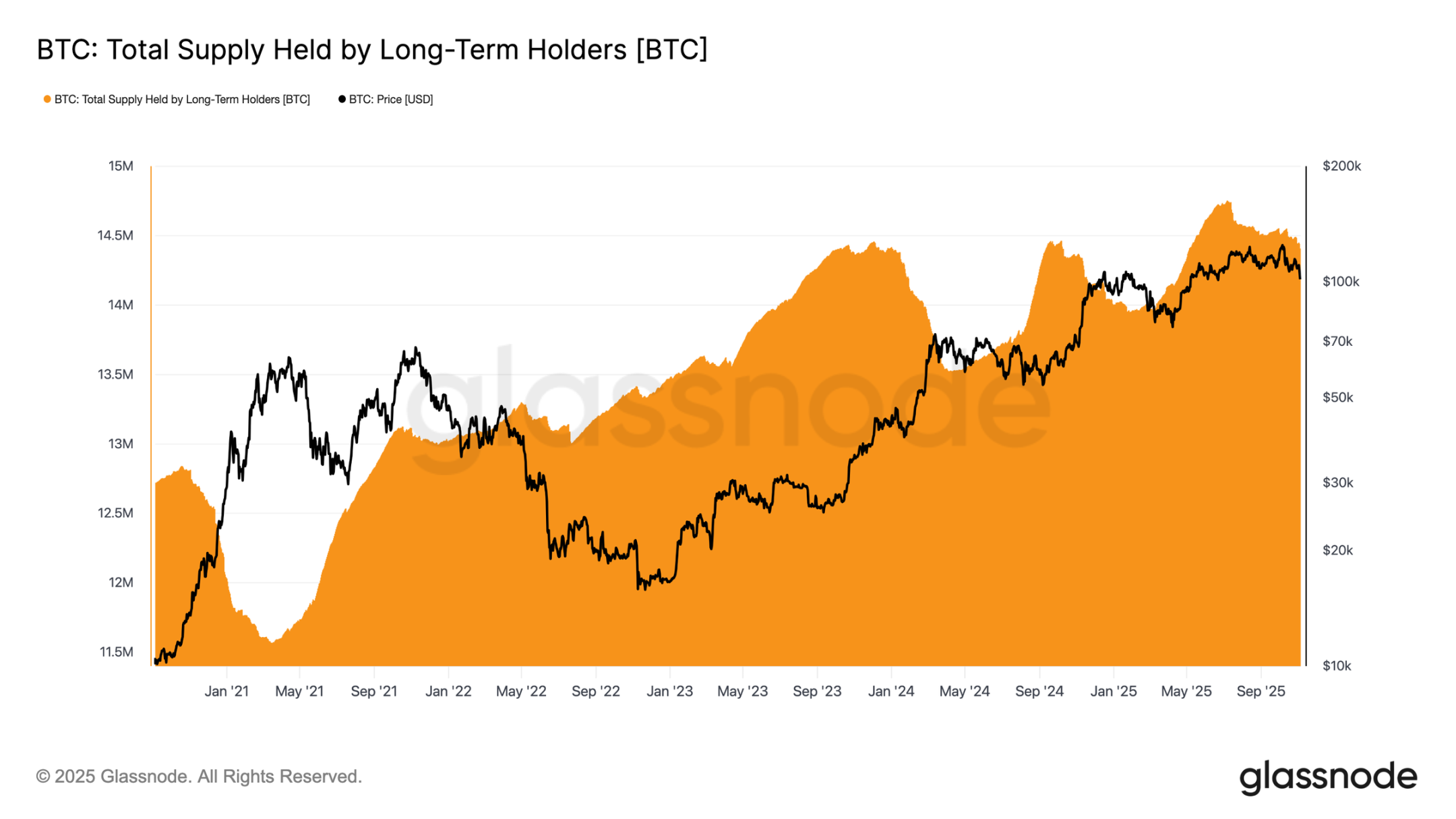 在此期间, 长期持有者的比特币持有量减少了约 30 万枚(从 1470 万枚降至 1440 万枚)。 与本轮周期早期的出售浪潮不同:当时长期持有者在大幅上涨期间 「逢涨抛售」,而此次他们选择 「逢弱抛售」,即在价格盘整且持续走低时减持。这一行为转变表明,经验丰富的投资者已显露出更深的疲惫感,信心有所下降。