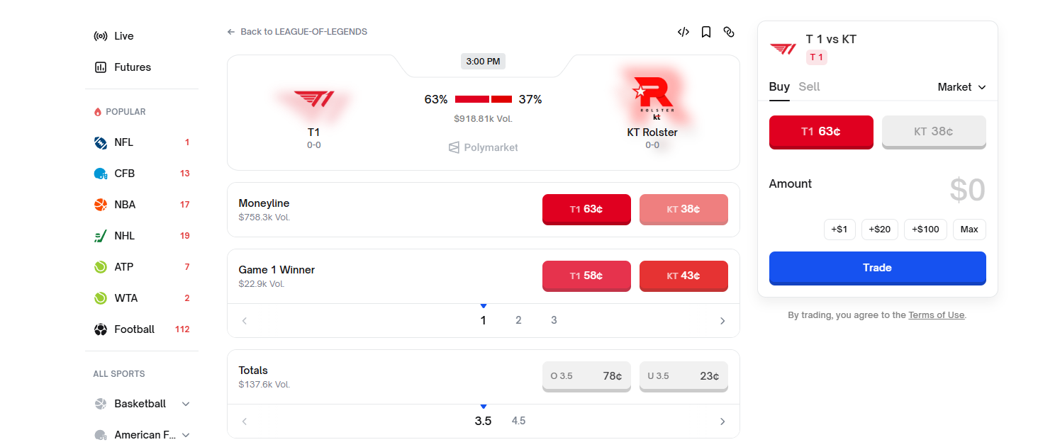 STEP 4. 以 T1 vs KT 为例,可下注的种类分为 BO5 获胜方(目前 T1 胜率为 63%)、单局获胜方(目前 T1 单局胜率为 58%)以及比赛场数。