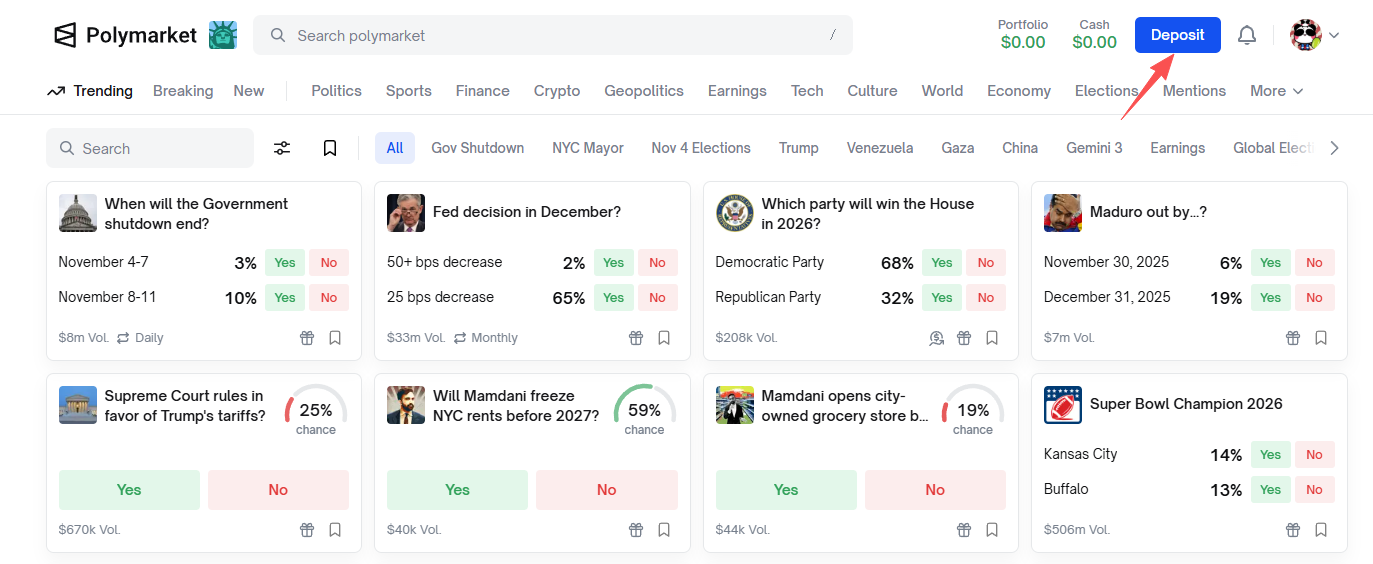STEP 2. 登录账号后,点击“Deposit”进行账号充值,选择充值途径(支持多个网络)。