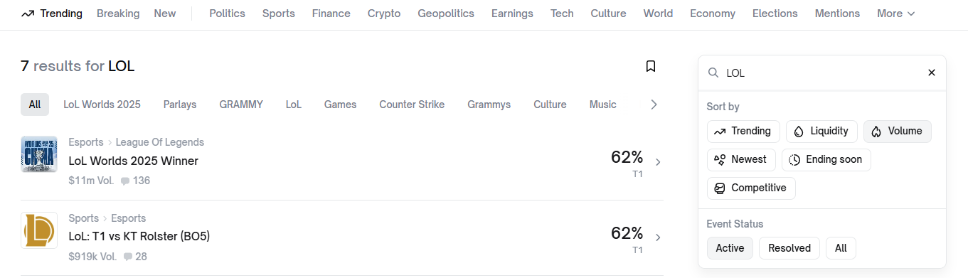 STEP 3. 充值完毕后,在搜索栏输入 LOL 后,交易量最高的两个事件分别为 LOL S15 总决赛胜者、T1 vs KT。