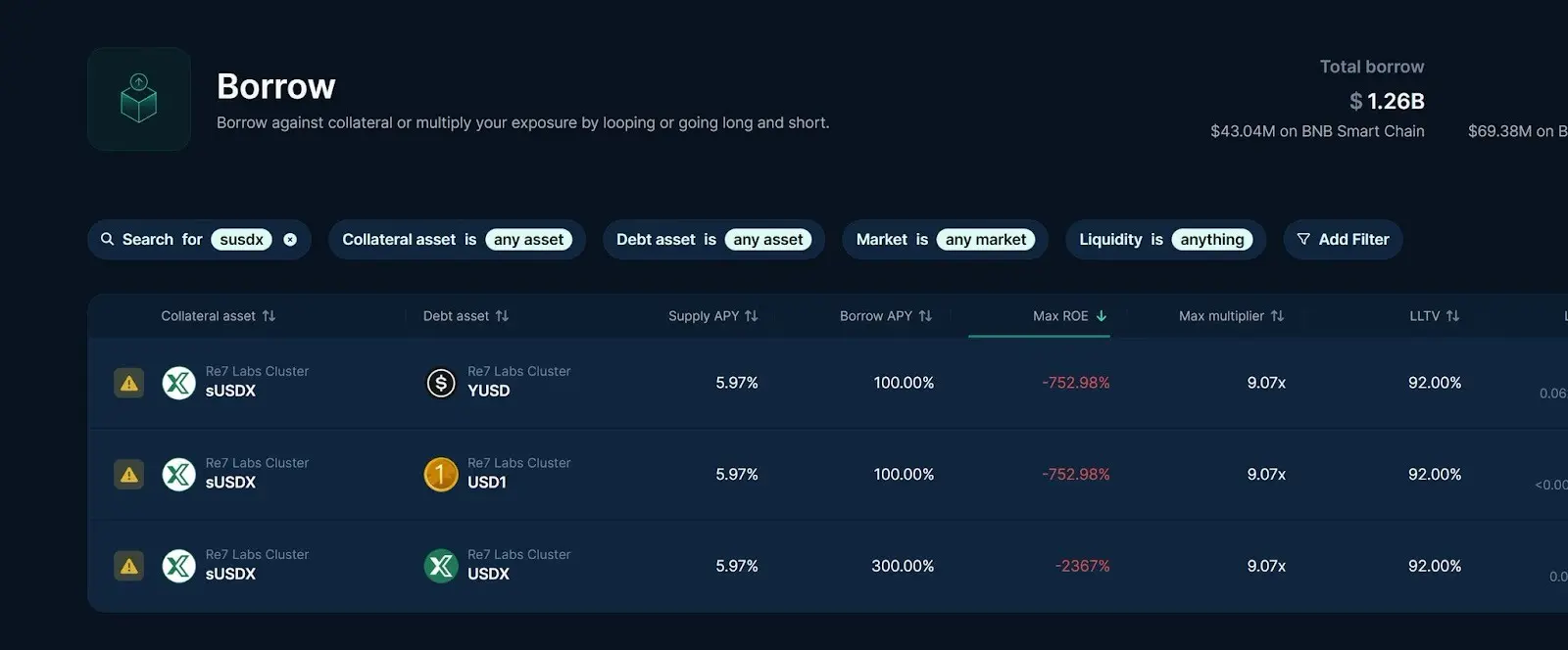 而借贷平台 Morpho 和 Euler 的隐藏市场利用率飙升至 95% 至 100%,借贷利率一度出现负 752% 的异常数值,显示抵押品已成死账。Compound 则紧急关闭部分市场,Silo、Treeve 的 scUSD 等协议也跟随脱钩。