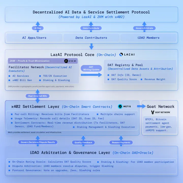 当一项 AI 服务被调用时,相关的 DAT 会触发 GMPayer 的 x402 结算层智能合约,自动执行按次调用、实时分账。这使得数据贡献者、模型开发者等所有价值创造者都能精确、即时地获得回报,从协议层面建立了可信的贡献回报体系。