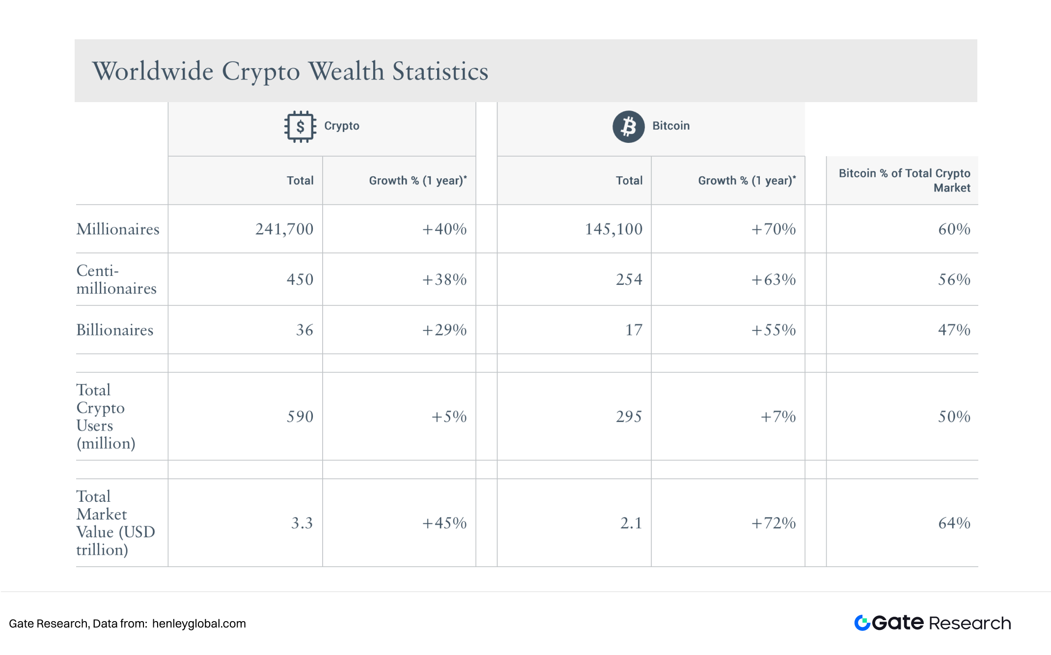 3. 高净值持有量:截至 2025 年 6 月,全球加密资产超百万级高净值群体持有量超 2,425 亿美元,同比增长 40%。
