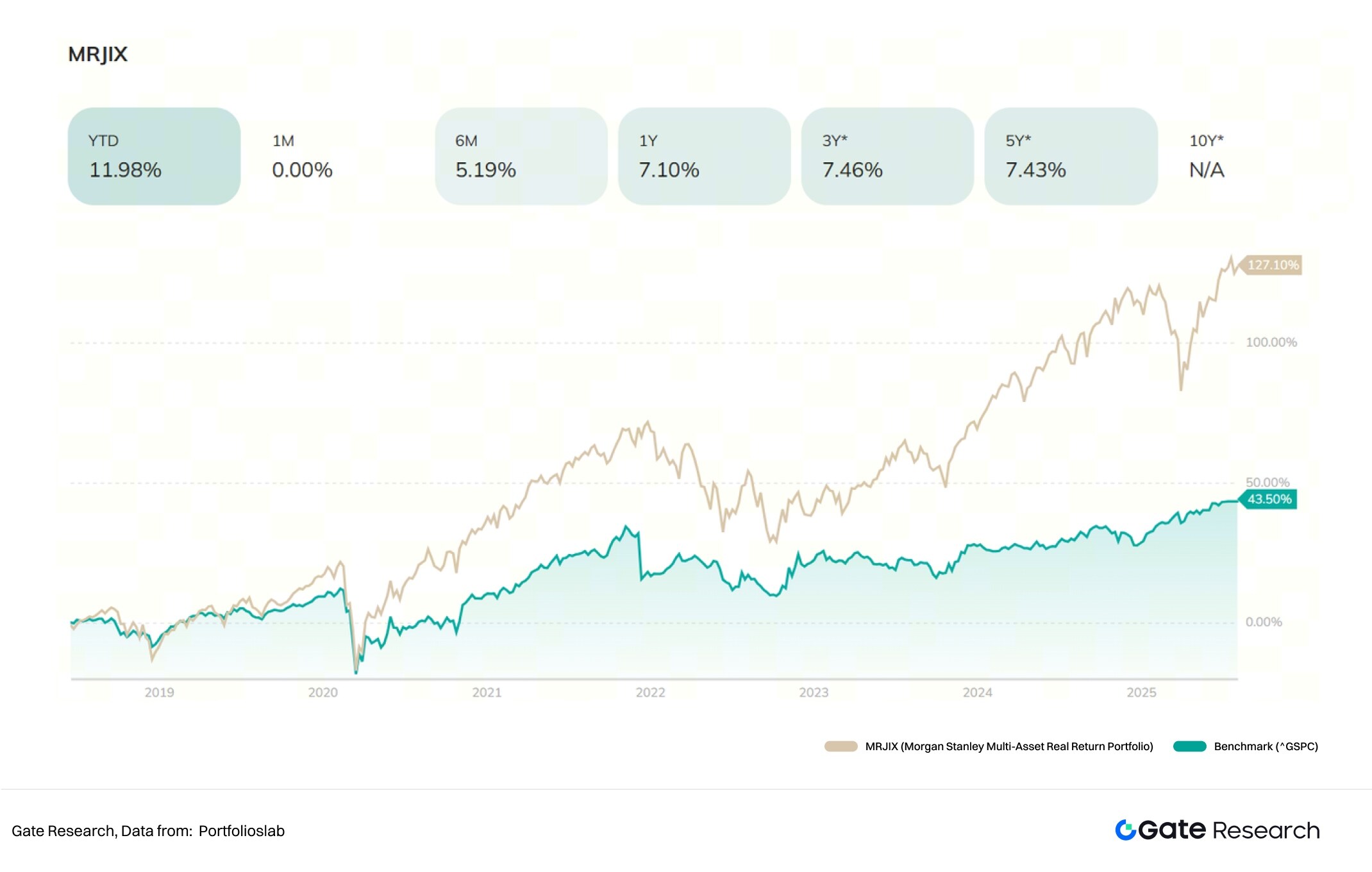 由于 PWM 产品具有高度定制化属性,机构通常不会公开披露具体的投资组合表现数据。以摩根士丹利发行的稳健型混合资产策略基金 MRJIX 为例,其近一年收益率为 7.10%,波动率与最大回撤均显著低于基准 S&P 500,充分体现了多元化资产配置所带来的稳健增值能力。
