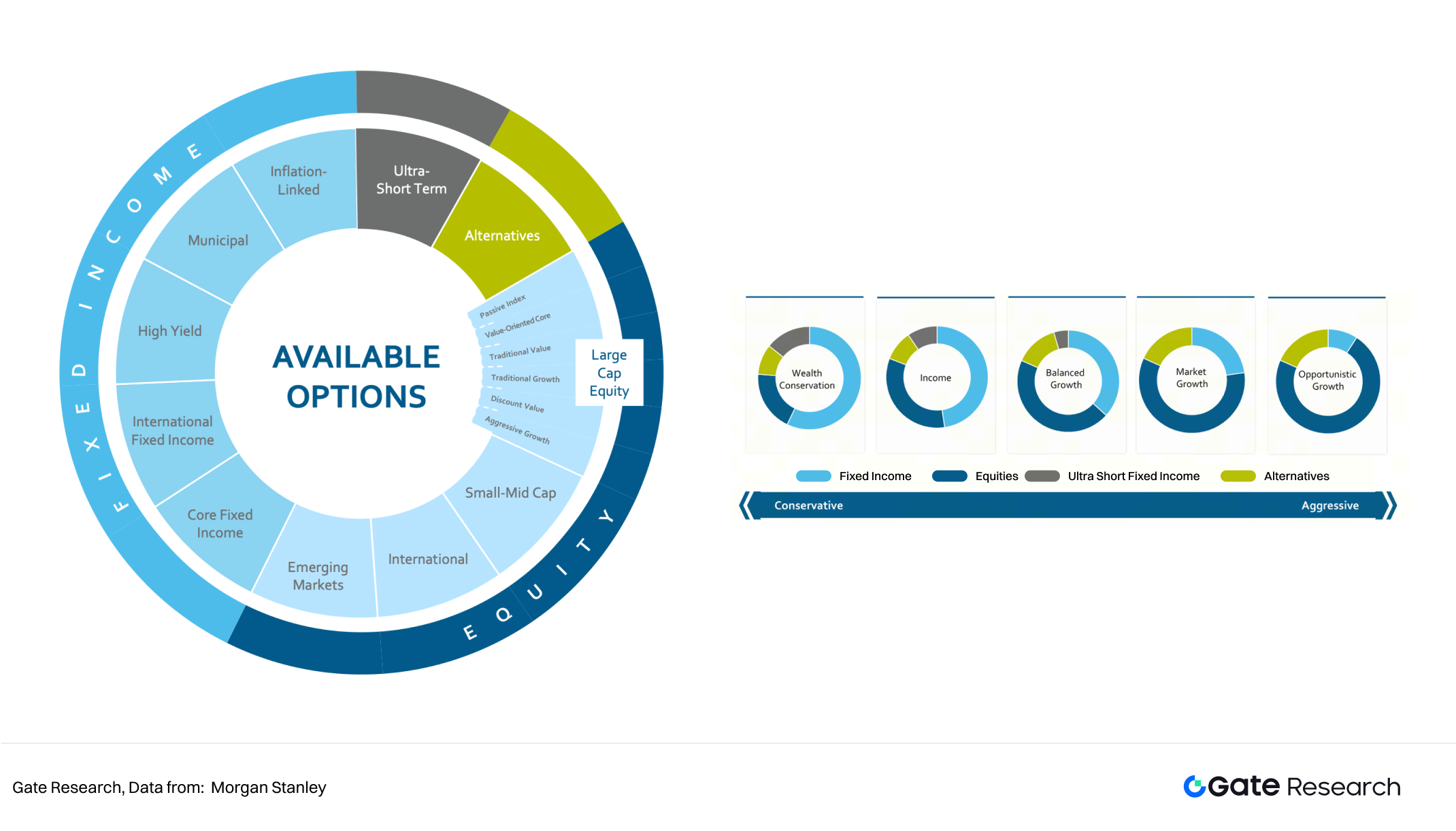 下面将以摩根士丹利为例,梳理传统私人财富管理的服务架构与投资策略;同时以 Gate 私人财富管理业务为案例,分析加密财富管理在收益模式、策略迭代和客户定制化方面的特点,从而对比两类机构的核心差异与实践经验。
