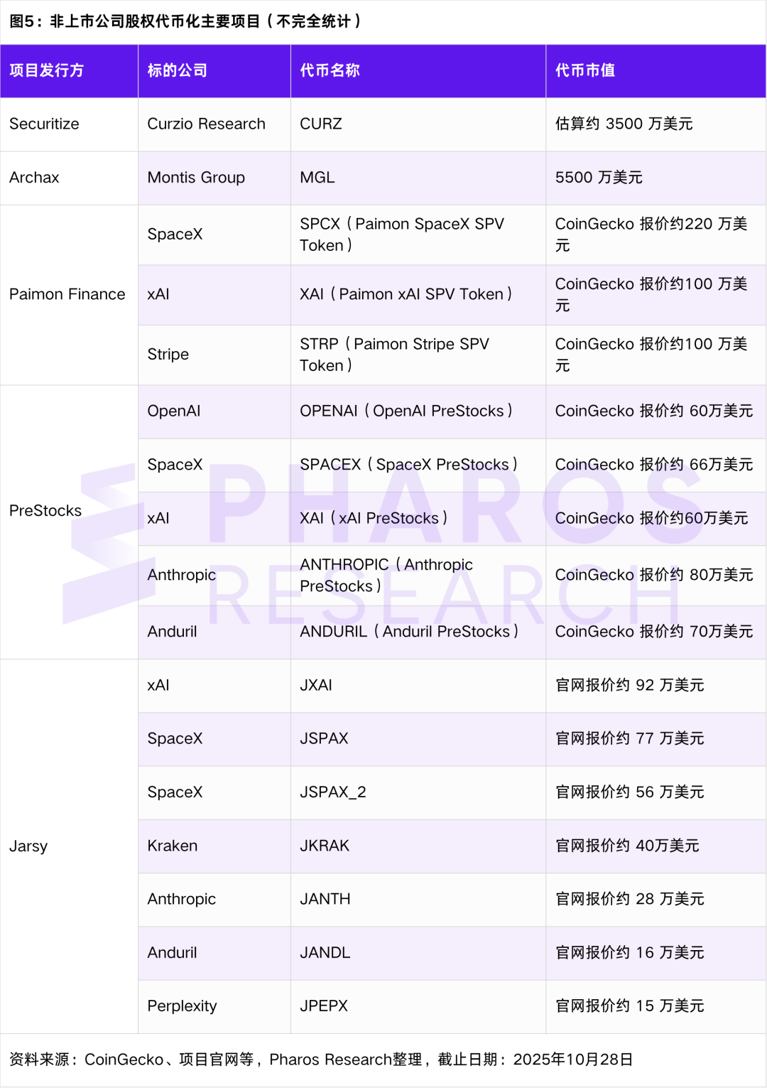 (2)市场已分化出三种主流模式:原生协作型(合规但落地少,如 Securitize)、合成镜像型(纯衍生品,如 Ventuals),以及 SPV 间接持有型(如 PreStocks、Jarsy)。
