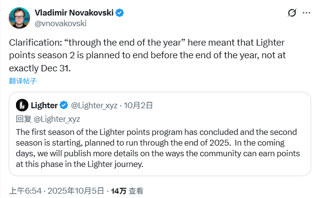 Lighter 创始人:第二季积分活动将在年底前结束,而非 12 月 31 日