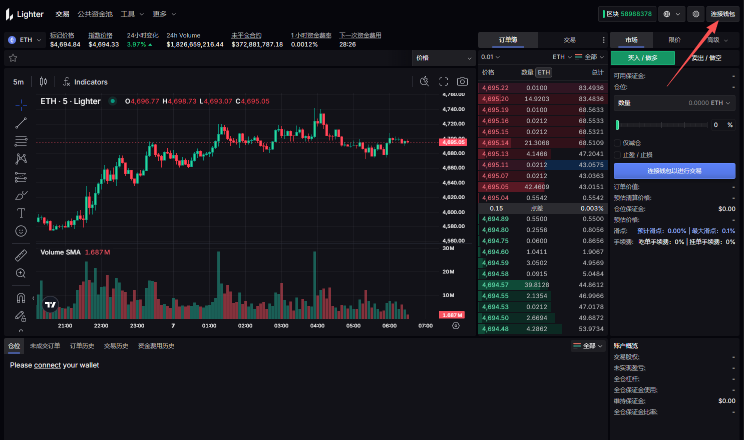 STEP 1. 进入官方平台(链接: https://app.lighter.xyz/trade/ ),连接钱包完成账户登陆。