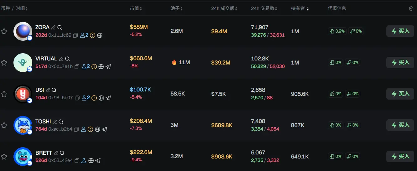 过去 24h Base 热门代币前五依次为:ZORA、VIRTUAL、USI、TOSHI、BRETT