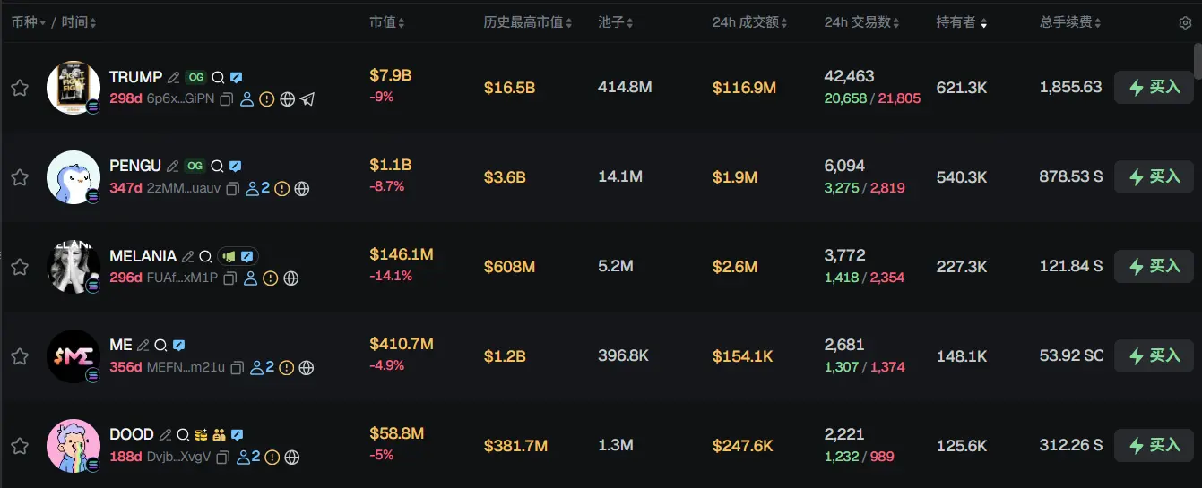 过去 24h Solana 热门代币前五依次为:TRUMP、PENGU、MELANA、ME、DOOD