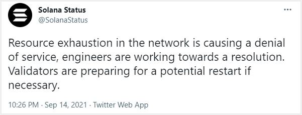 上图:9月14日,Solana 官方推文表示该网络由于“网络资源枯竭”而导致服务中断。