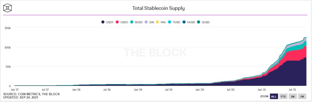 上图:截至撰文时,美元稳定币的总流通市值超过了 1,250 亿美元。图源:The Block