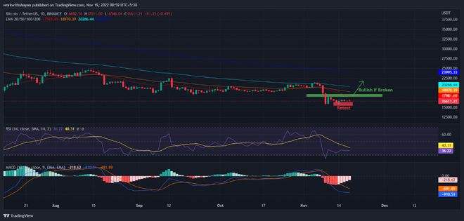 从日线图来看,比特币市场已进入短期盘整区间,BTC 价格从上周开始一直徘徊在 $16K-$17K 区间。比特币在今天以 1.7 万美元的价格再次遭到拒绝后,目前的交易价格为 1.65 万美元。