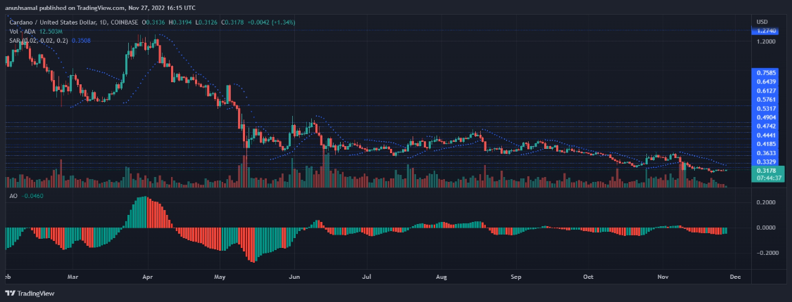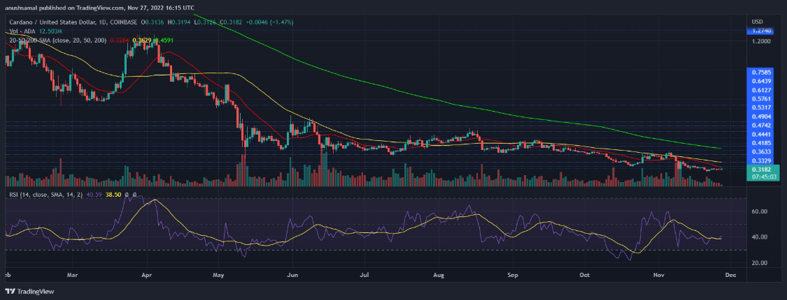 卡尔达诺价格在整个 11 月继续呈下跌趋势。在过去 24 小时内,ADA 贬值了 0.6%。ADA 的下一个即将到来的交易时段仍然至关重要,因为市场预计将退出横向交易。