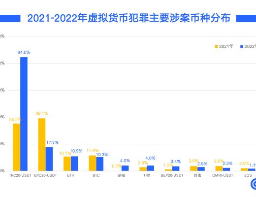 2022年TRC20-USDT跃居首位,增至84.6%,同比增长约140%,成为当前虚拟货币犯罪中使用频率最高的币种。