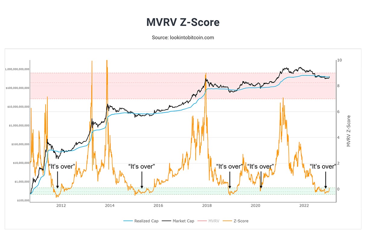 大多数被迫和恐慌性抛售都发生在低点。这种情绪表可参考下图,我们可以看到情绪指标 MVRV Z-Score 正处于脱离绿色累计带的窗口期。