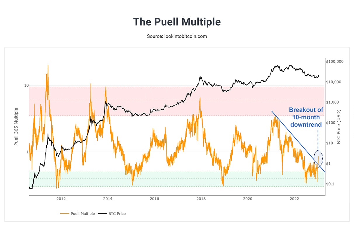 目前 Puell Multiple 指标从绿色累计带中反弹,这或许标志着熊市的结束和新牛市的开始。