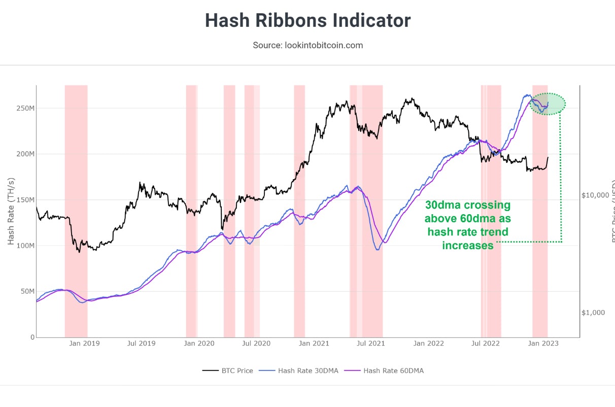 另外一个指标:哈希带指标,也表明短期内比特币价格可能会继续上涨。2022年很多矿工关闭矿机、被迫出售比特币等,使得难度调整和哈希率的变化在哈希带上出现交叉。此交叉意味着该行业在经历了一段时间的严重压力后得到了喘息的机会。