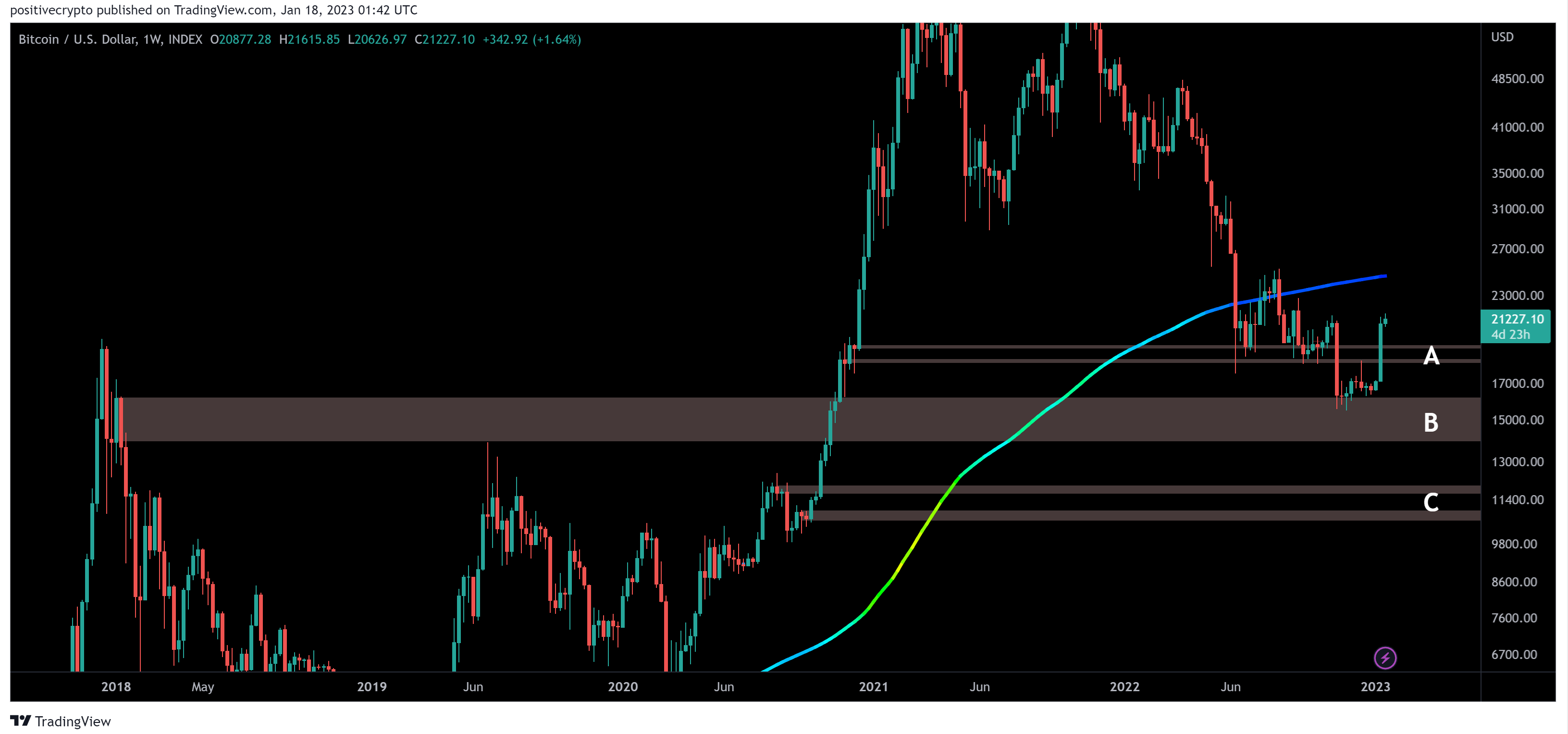 目前,BTC的K线图如下,在低点测试了支撑区域B后,价格已经反弹并突破A区域。A区域是FTX崩盘前的主要支撑位。