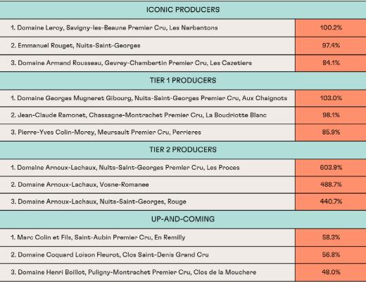 而在勃艮第,新星和顶级名家一样被买家青睐。可以从下表看到,2022年Leroy、Rousseau等名庄发挥稳定,但涨幅最大的是由年轻小生接管的Arnoux-Lachaux。两年前,Arnoux-Lachaux曾属于Cult Wines的新星榜单,现在已经稳坐第二梯队,而且仍在飞速提升 —— 两年前按照新星榜单入手的买家,恭喜恭喜啦!