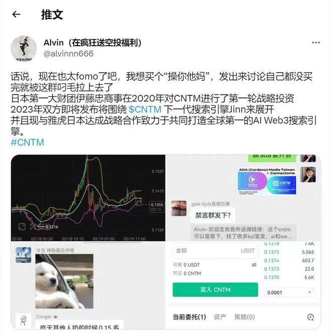 1、海内外大V主力宣发,各类社群也是异常火爆,倪森Phyrex推特上分享大盘走势的Top3助力CNTM起飞!