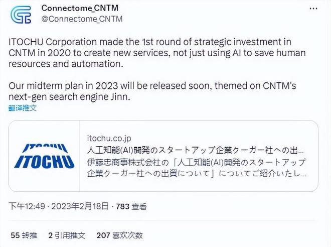 我们再回到CNTM里,日本雅虎与CNTM正式达成了合作。日本第一大财团 伊藤忠商事株式会社已对CNTM进行战略投资 2023年中期计划“Brand New Deal 2023”将围绕下一代AI智能搜索引擎展开。就拿这一点来说,CFX与CNTM有异曲同工之妙,想必CNTM的涨势也将因为此次的合作而极度飙升!