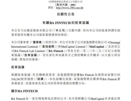 国富创新有限公司(290.HK)近日宣布,已与MaiCapital Limited以及其母公司BA Fintech Lab Limited签署了一份新的股东协议,正式成为MaiCapital的股东和战略合作伙伴。MaiCapital是香港第一批受证监会监管并获发牌开展证券及期货条例项下第4类及第9类虚拟资产受规管活动的资产管理公司,可管理投资份额为百分之百于虚拟资产的投资组合。此次股权投资,是传统金融平台和新兴经济产业的碰撞和融合,将推动这家传统金融服务平台向虚拟资产受规管活动上进行转型和升级。