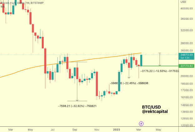 “BTC 的最佳状况是在当前走势中打破 200 MA,”𧹒卖员和剖析师 Rekt Capital对 BTC/USD 与 200 周 MA 之间当前的互相作用停止了争论。
