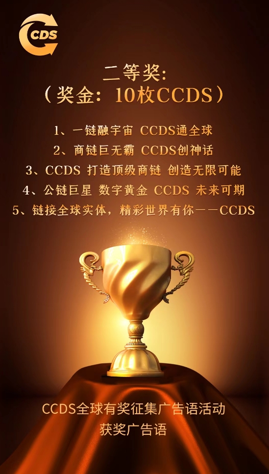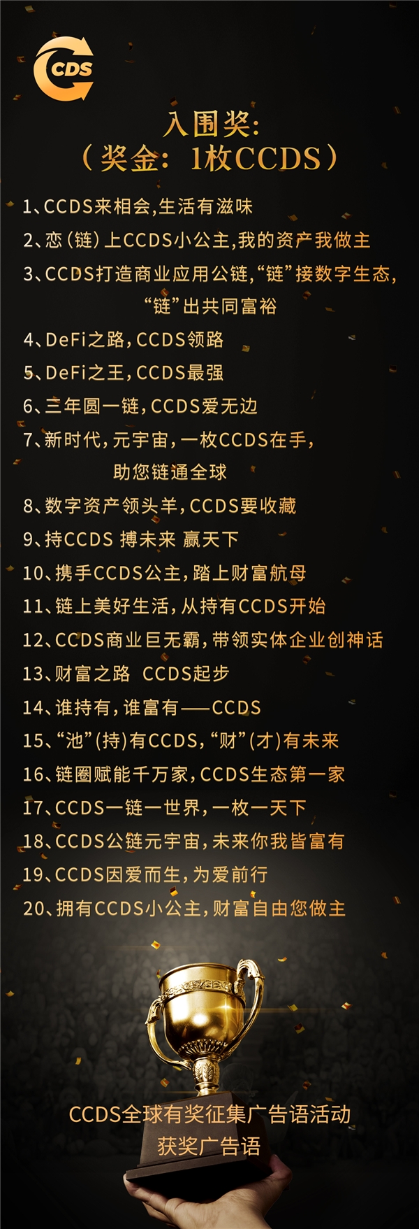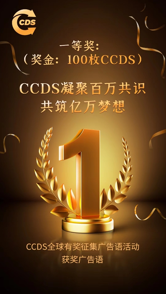 关于荣获一等奖的广告语“CCDS 凝聚百万共识,共筑亿万梦想”,作者对此的解读是:未来CCDS首要目标就是达到十万一枚,总价值将达到万亿,这万亿的价值是CCDS数百万贡献者共同努力的结果,承载这数百万人的梦想,当CCDS将全球第一条商业级应用公链打造成功之时,就是这数百万人财富和精神的双重丰收的时刻。